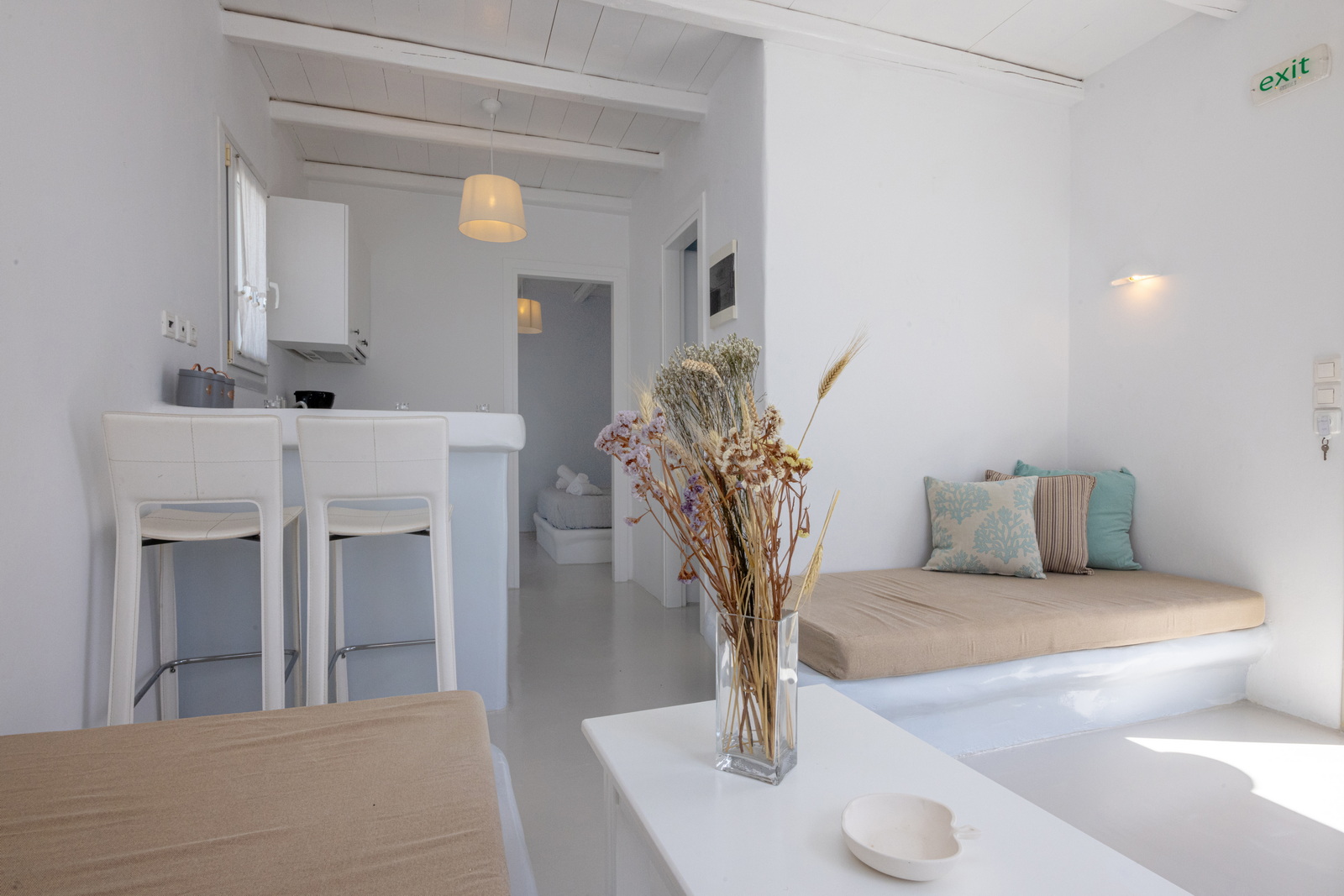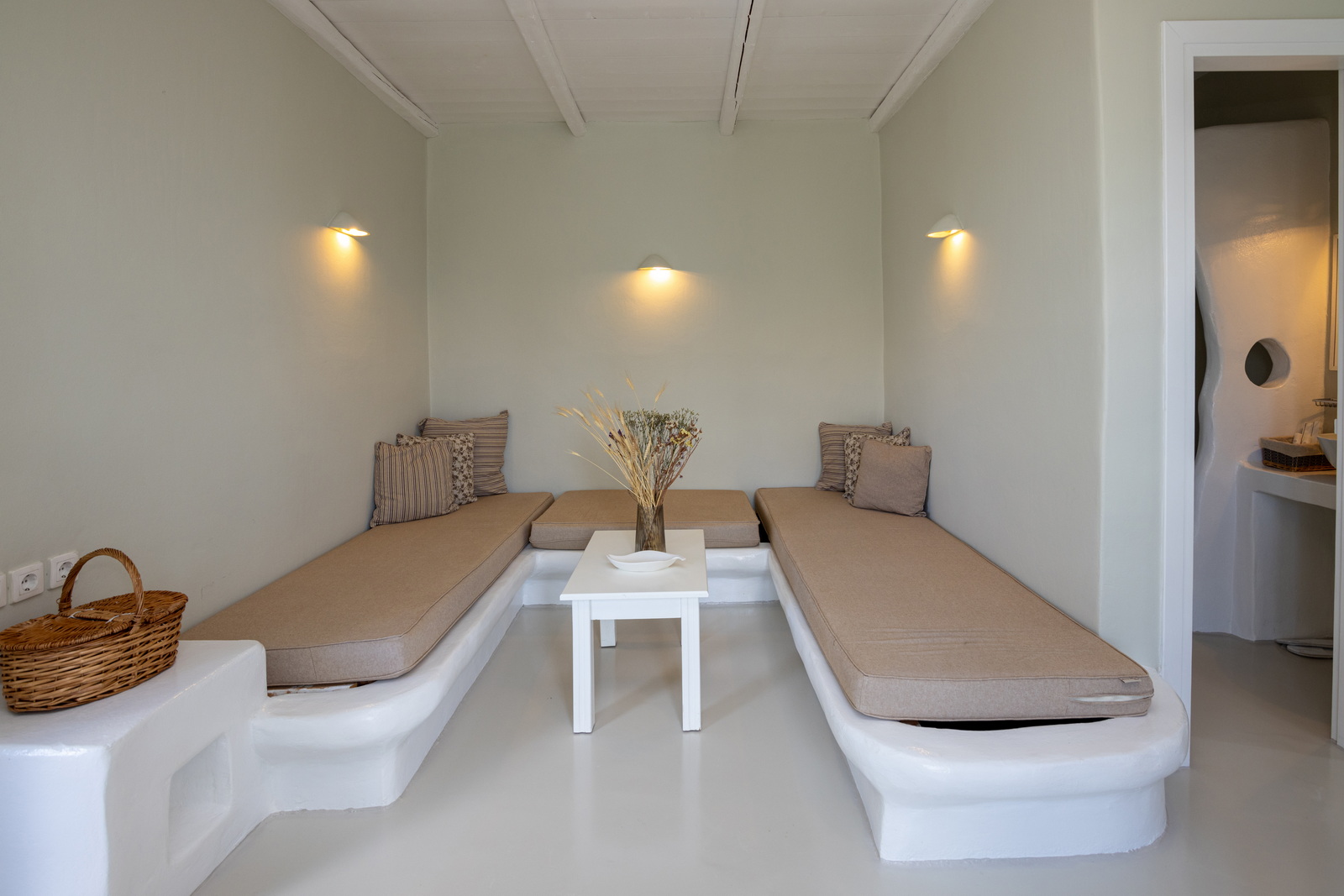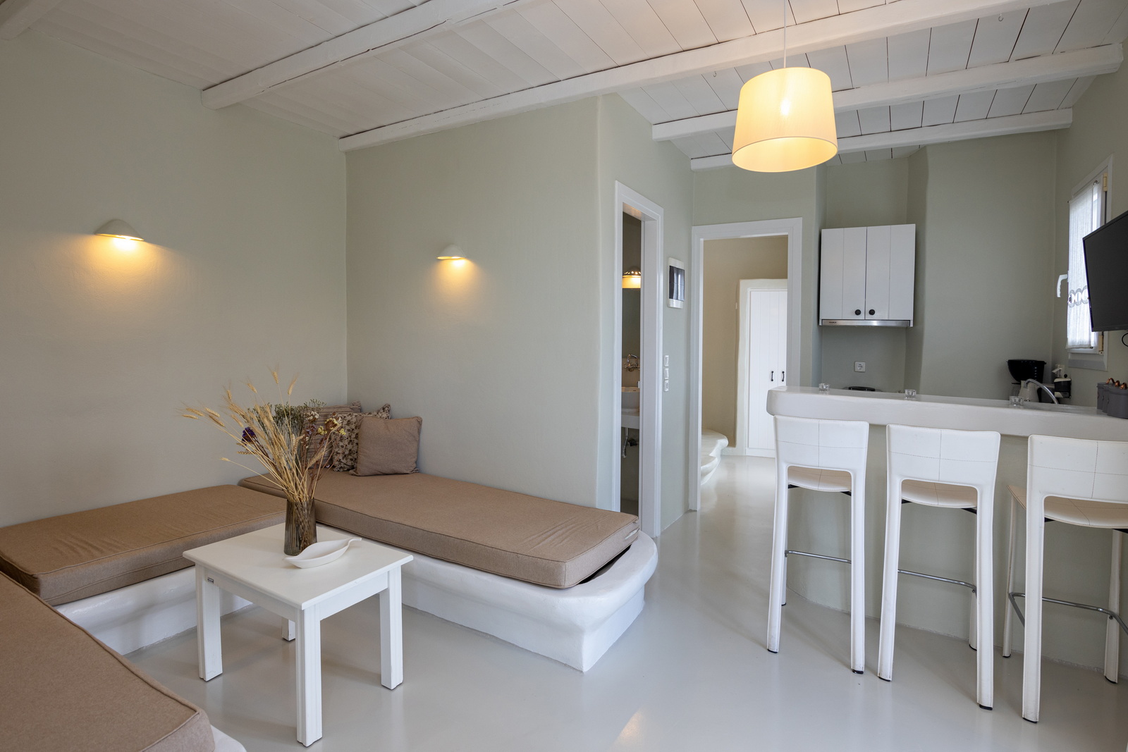 Η σουίτα είναι κλιματιζόμενη και διαθέτει ιδιωτική είσοδο, 1 σαλόνι, 1 ξεχωριστό υπνοδωμάτιο και 1 μπάνιο με καμπίνα ντους και στεγνωτήρα μαλλιών. Στην κουζίνα θα βρούμε ψυγείο και φρυγανιέρα και στο σαλόνι τηλεόραση επίπεδης οθόνης. Η σουίτα έχει 3 κρεβάτια.