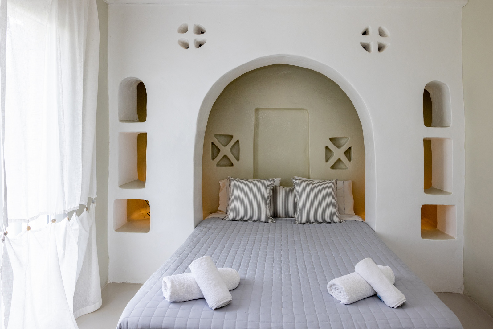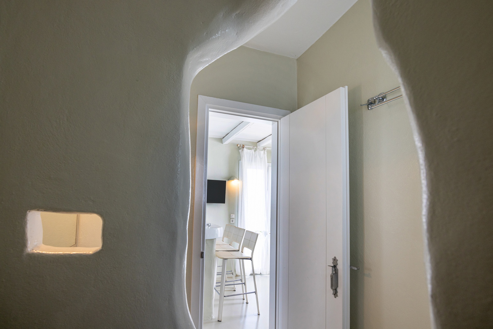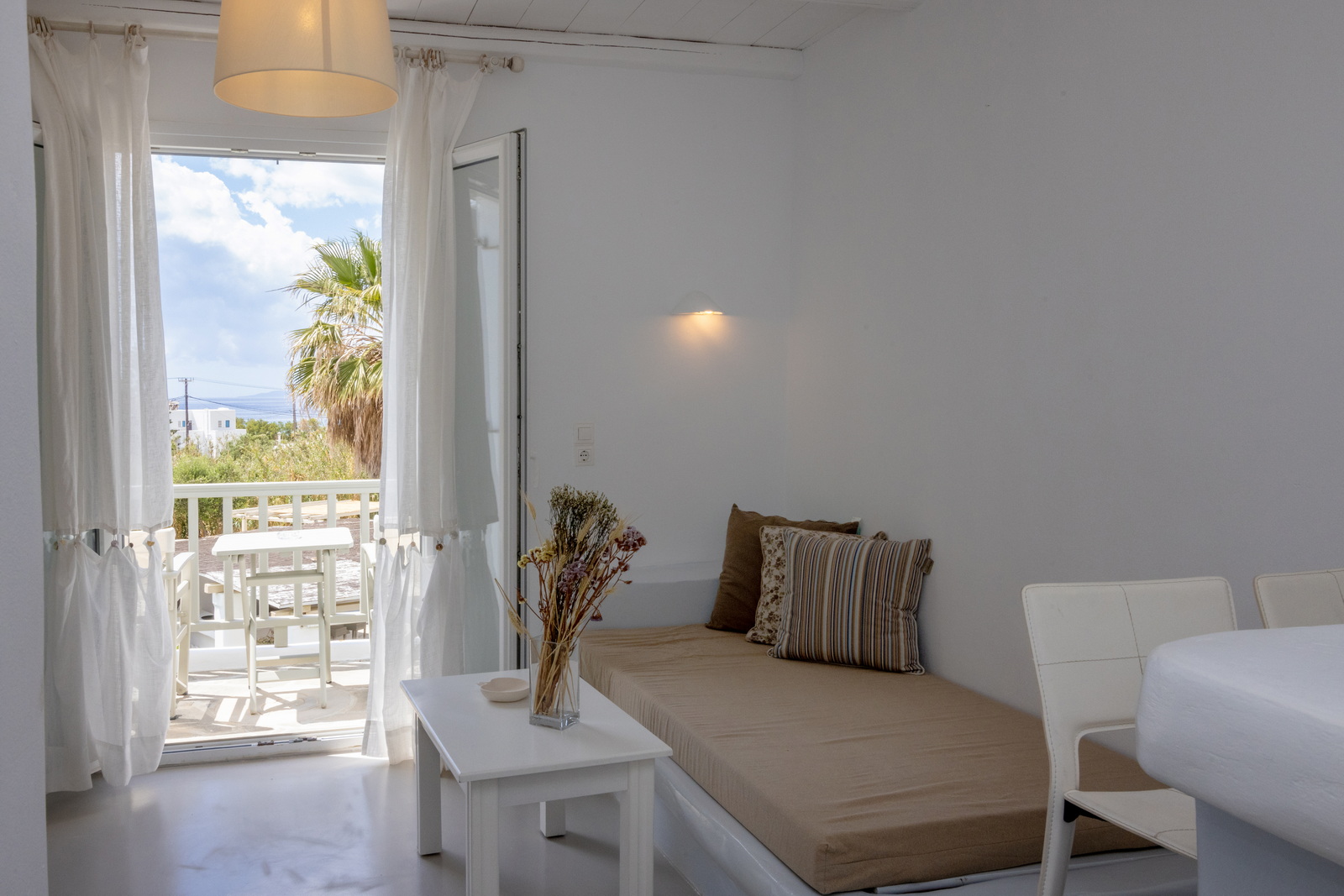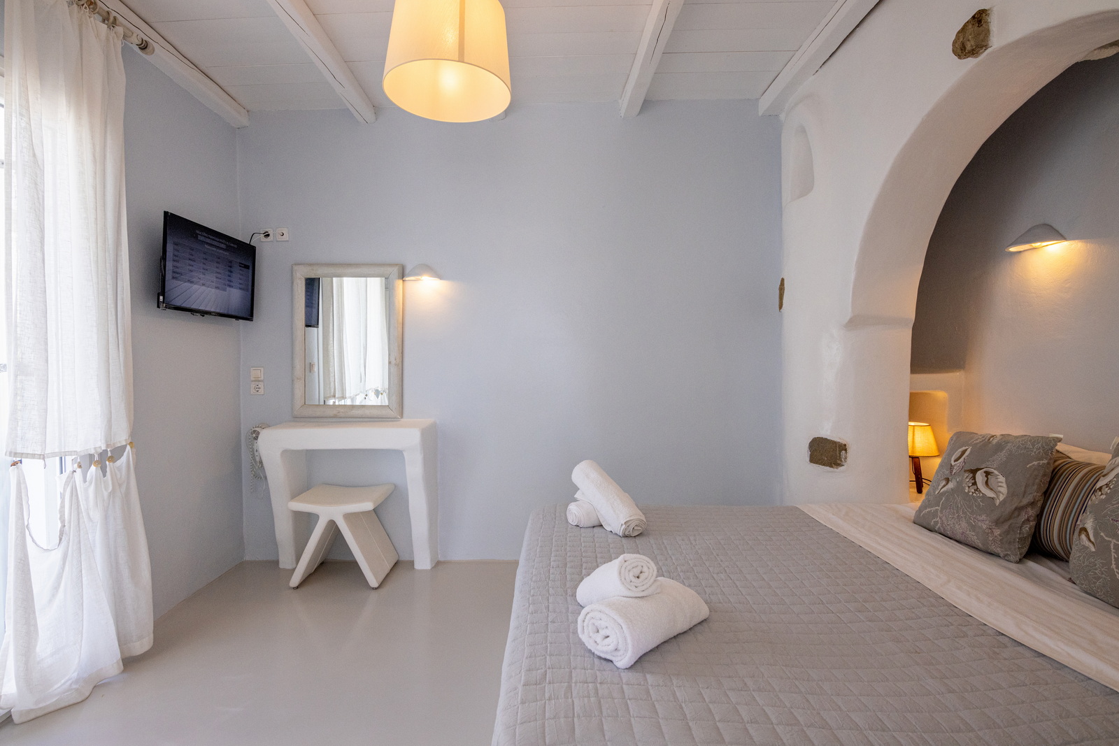 Η σουίτα είναι κλιματιζόμενη και διαθέτει ιδιωτική είσοδο, 1 σαλόνι, 1 ξεχωριστό υπνοδωμάτιο και 1 μπάνιο με καμπίνα ντους και στεγνωτήρα μαλλιών. Στην κουζίνα θα βρούμε ψυγείο και φρυγανιέρα και στο σαλόνι τηλεόραση επίπεδης οθόνης. Η σουίτα έχει 3 κρεβάτια.